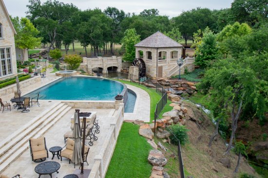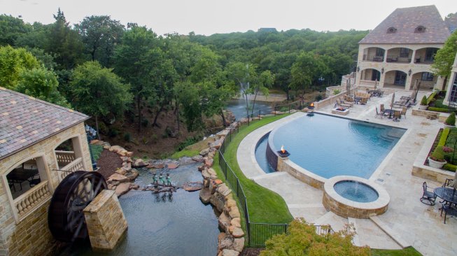 The French manor styling — with the baroque balustrade, slate roof, and wooden waterwheel — bring a refined look to the property. But even more impressive is the amalgamation of man-made waterfeature and clever runoff control system into one aquatic network.