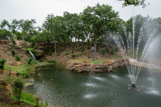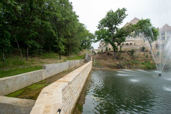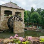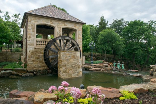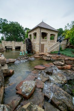 A cleverly choreographed stream with water wheel honors the French classic architecture and directs overwhelming runoff