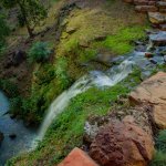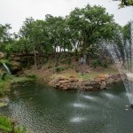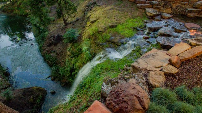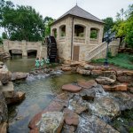 The basin near the waterwheel captures silt and dirt before it can flow down a 25-foot cliff toward the pond. The pavilion attached to the water wheel also serves as a shelter for the equipment that powers the waterfeature and adjacent pool/spa combination.