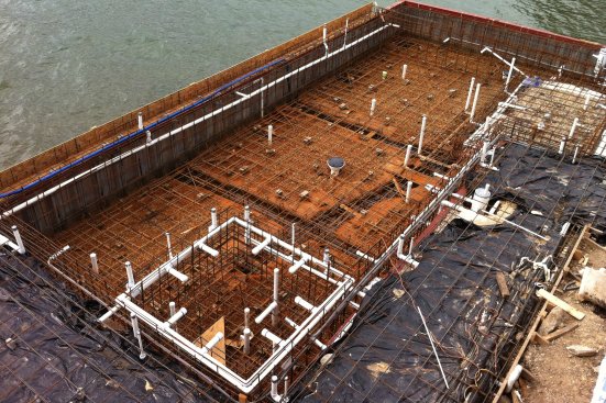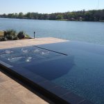 In addition to the mere fact of having a pool inside a lake, designers and builders had to prepare it for an unusual reality: To combat an aggressive pest that takes over the lake, the city regularly drains and refills it, causing the water level to fluctuate wildly. Upon refilling, the lake generally will rise past the pool’s elevation and submerge it. So the vessel had to be built to withstand this. To support the poolscape, 19 pilings measuring 66 feet were driven into the lake floor to reach bedrock. The pile driver had to be brought in by barge. Between the horizontal beams, located directly under the pool and tying the pilings together, the team placed gravel so that the highly expansive clay soil could swell freely and without consequence.
