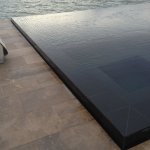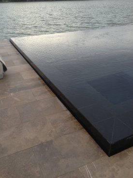 Fashioned to look like a black cube on the water, the pool/spa combination is surrounded by perimeter-overflow slots and a vanishing edge. Catch basins and gutters are topped with stone to conceal the overflow.