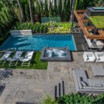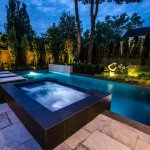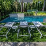 We see very interesting use of the thin vertical elements on the backside of the pool. The fountain wall and staggered glass panels have the effect of making the overall space feel larger — not smaller. The use of the glass panels and sculpture draw the eye beyond the pool and create another “room” to the rear property. Quite nice!