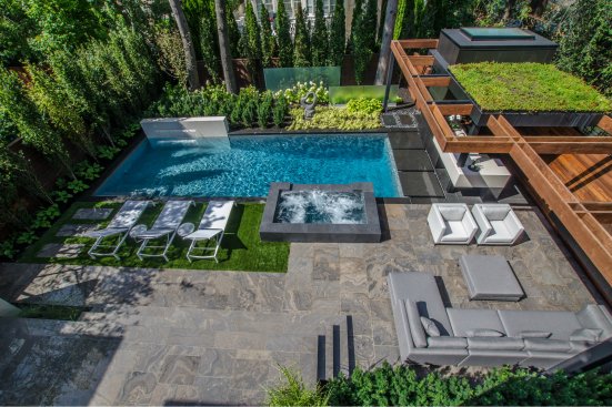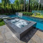Simple forms and monolithic color/texture blocks make for an elegant presentation of this small backyard poolscape