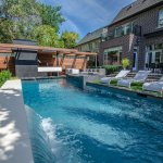 The yard’s shape dictated that the waterscape run parallel to the house. To add interesting view corridors from the home interior, the designer employed a common strategy of his. He placed the outdoor kitchen in view of the interior living area and the pool lounging space across from the home’s kitchen. “I never like to see a dining room outside mirrored by a dining room inside [or] a lounge area outside mirrored by a living area inside,” he says.