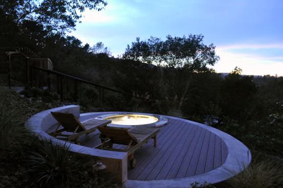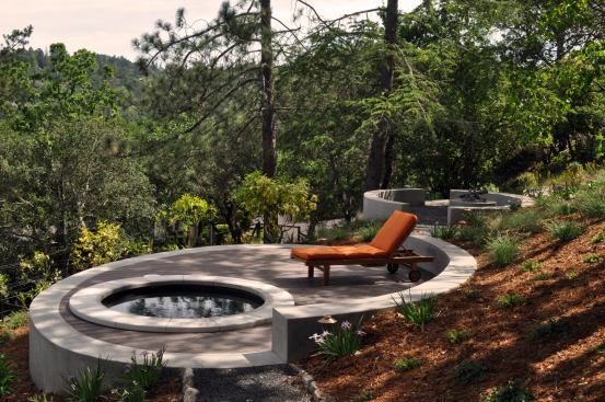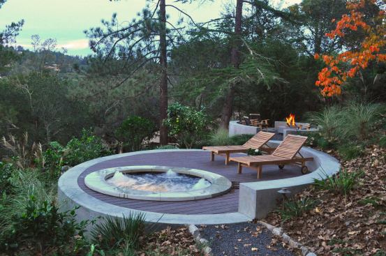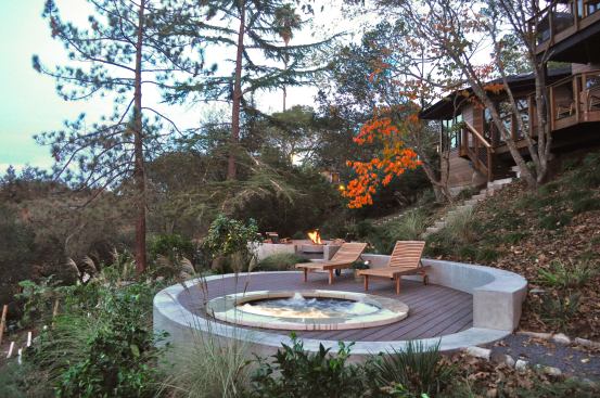Precise placement and intricate details naturally tie this Bay Area home's spa with the surrounding hillside