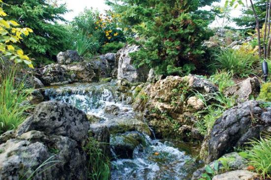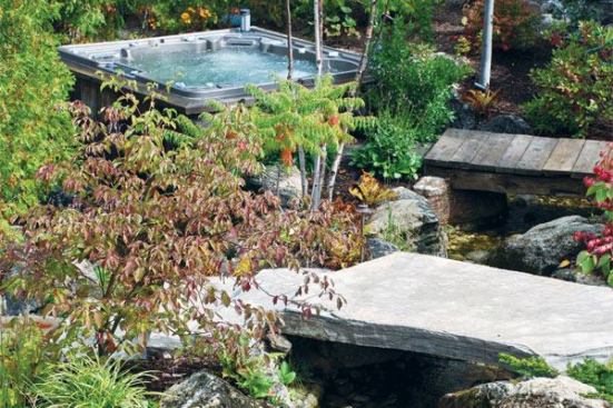Through creative use of plantings, elevations and strategically placed waterfeatures, as well as other elements such as a gazebo, fire pit, barbecue island and cabana with kitchen, the Canadian property was transformed into a secluded retreat.