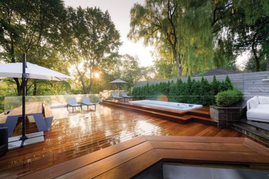 Ravine scene: Toronto’s ravine lots are renowned for their scenic views, but homes situated on these steep banks have limited options for backyard amenities. However, geography wasn’t going to prevent this homeowner from taking a dip in his own personal pool. He had a foundation wall constructed and put down a concrete pad on which he, himself, built this eye-pleasing entertaining space with Brazilian Ipe wood. The homeowner is a restaurateur and his foodie influence guided the design, which provides a wide open area where guests can mingle and enjoy culinary samplings.
