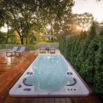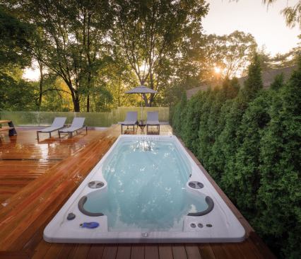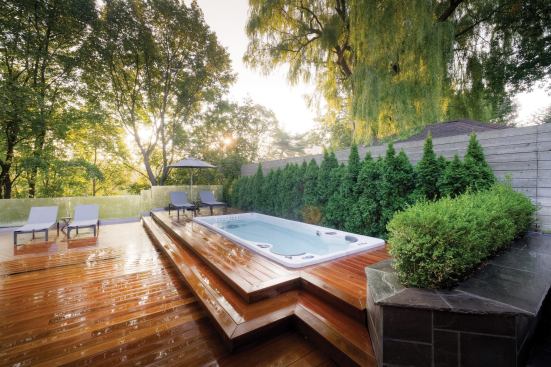 Modern tranquility: A 17-foot-long, 8-foot-wide swim spa provides aquatic recreation year ‘round. Along the length of the swim spa, cedars provide immediate privacy and soft-scaping, while a glass panel at the edge of the deck offers an unobstructed outlook of the wilderness beyond.