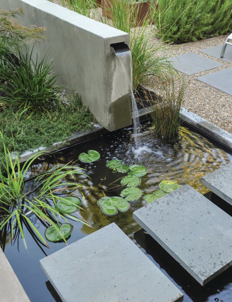 Repeating theme: Saw-cut bluestone squares were used for the floating stepping pads. “It’s a nice passage to walk across the water,” Huettl says. They were repeated throughout the yard, often in grid patterns set on a field of crushed rock, as seen underneath the chaise lounges, or concrete. “We were designing everything in this yard in a rectilinear fashion, so the grid was a nice look,” Huettl says. “It provides interest and a bit of visual structure and design strength. The repetition is not readily apparent until you walk around the yard.” The pond was kept 17 inches deep and stocked with small mosquito fish that can better evade predators than can goldfish or koi. The 8-inch-thick pond walls were flared in at the top few inches, so only 2-1/2 inches show at ground level.