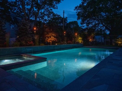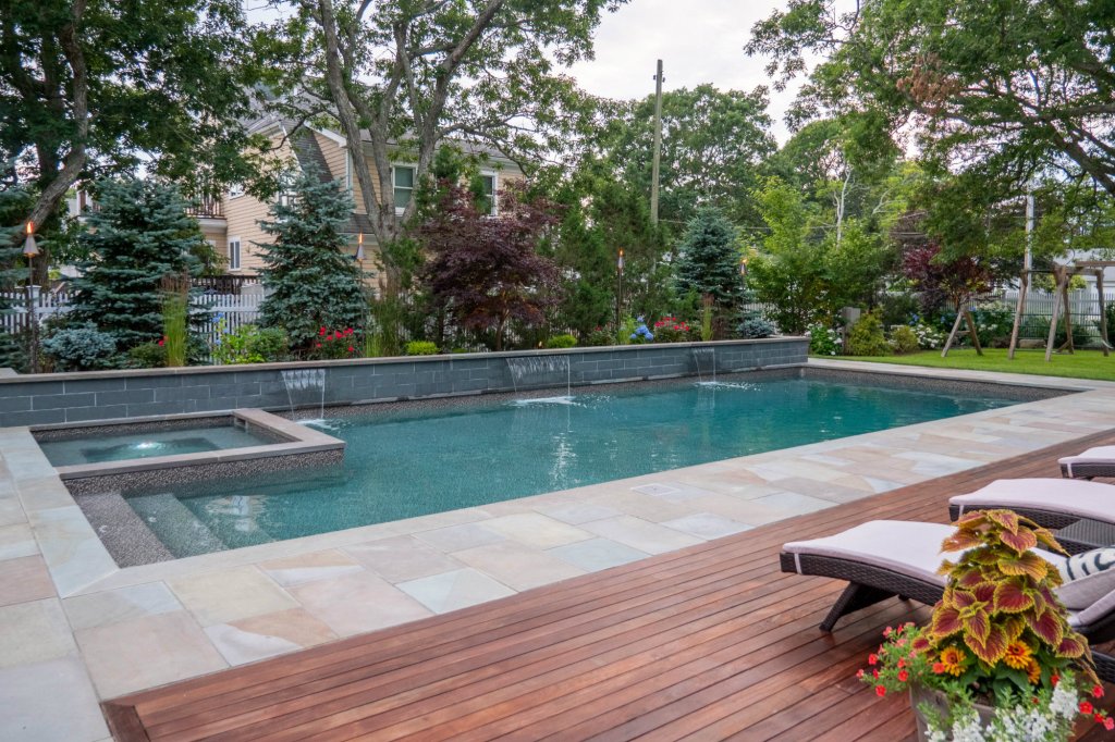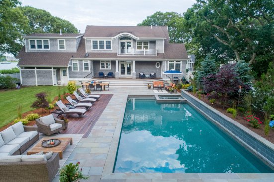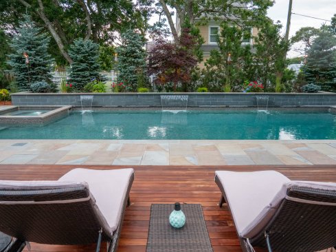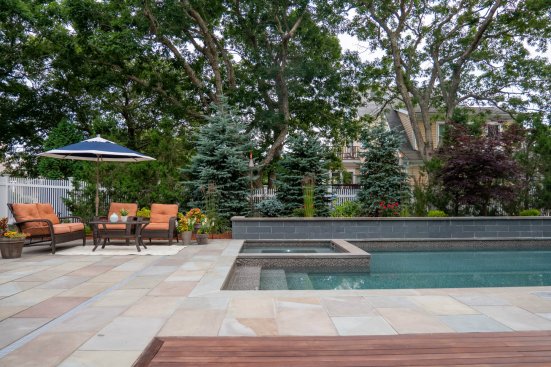The goal here was to integrate a new pool and deck into a lived-in Northeastern abode with an existing bluestone deck. Thanks to some strategic materials choices, the final product gives new life to the property, yet seems like it’s been there all along.