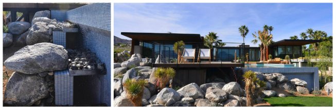 Inconspicuous detail: The designers used stainless steel trays and pebbles to break up the vanishing-edge spillover. Large boulders set in front of the unique system obscure it from the view of those looking toward the house.