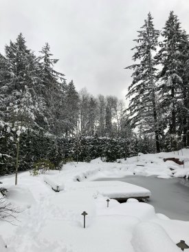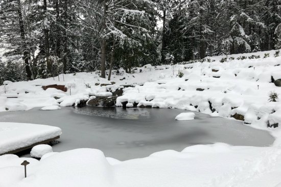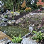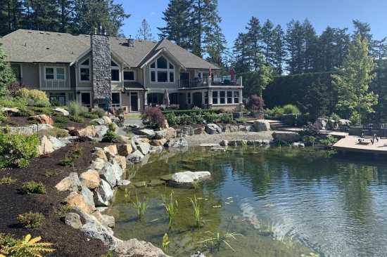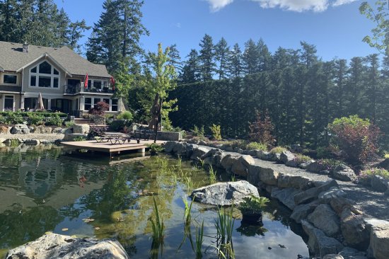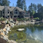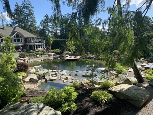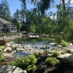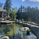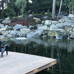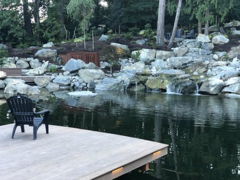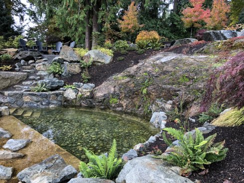 The team chose and placed each rock specimen around the pond, which is cleansed with plant materials that remove phosphates and nitrates. Pond filtration is formed with plumbing that pushes water up through different layers of gravel. While the main pond is 15 feet deep, a shallower regeneration zone borders it, varying from 18 to 24 inches deep.