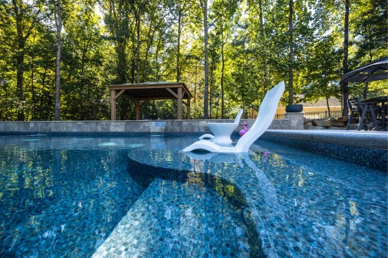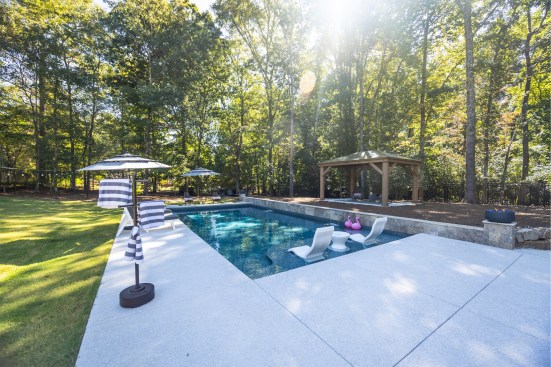 The pool itself was centered on the house, with the shallow end near the home. Its pool’s large shelf, made using a stainless-steel form to mold the concrete, is intentionally positioned close to the home to allow for easier entry and a space for the client’s grandchildren to play.