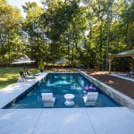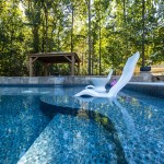 Having older children for this couple meant no more need to create a play pool. So when consulting with builder J&M Pool Co., they put the emphasis on aesthetics, seeking a highly custom look in their vinyl-liner installation. They didn’t want very much decking, but were seeking some ornamental touches.