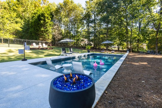 Durand’s team created multiple tiers in the backyard and built a wall on the side of the pool, which allowed them to shore up the earth and create a raised, flat seating area and a space for the firepit.