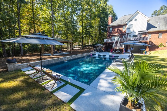 At the far end of the project, oversized concrete squares with synthetic turf between them create a visual break to transition from the pool area to the wooded area behind it.