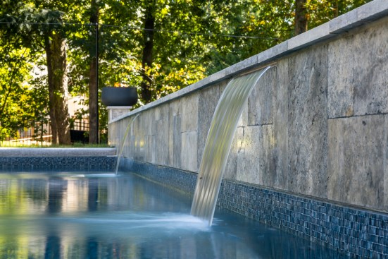 The team delivered, with a geometric pool, tiered wall veneered in large-format travertine, and two sheet waterfalls.