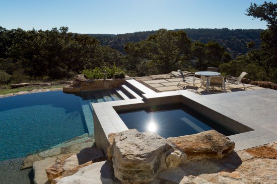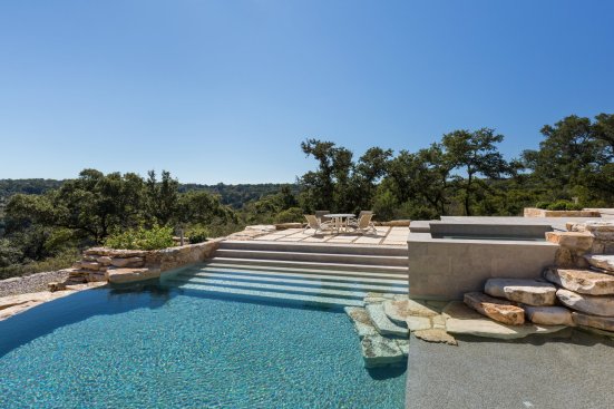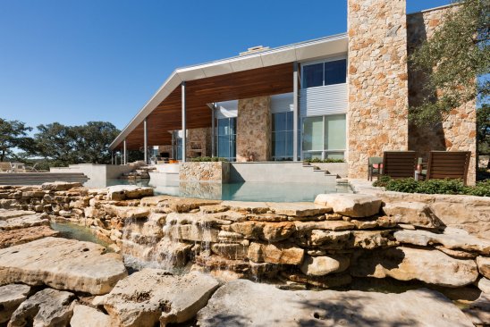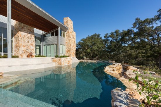 Pools generally take center stage, but in this case it had to play an important role: Serve as an aesthetic transition between the contemporary home and the natural surroundings of the ranch property.