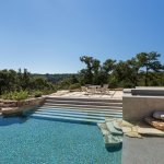 The pool itself transitions in style as it moves away from the abode. Closer to the building, the features are formed by straight lines and smoother materials. A larger-format, stone-textured architectural tile cloaks the raised spa and creates the deck surface. The same approach was taken with the pool’s statement-making steps, which span the width and carry the architectural tile into the water. At the generously proportioned sunshelf, the pool perimeter was drawn to mimic the angle of the roof.