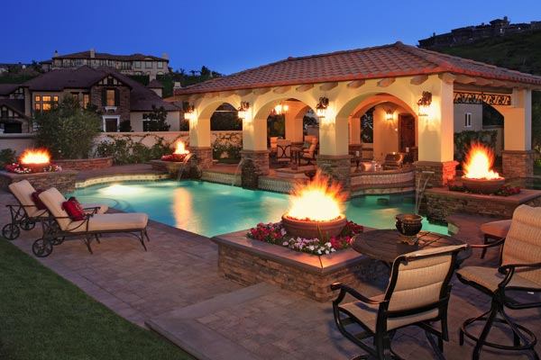 Four fire bowl, sheet-waterfall accents and an all-tile perimeter-overflow spa offer understated drama.