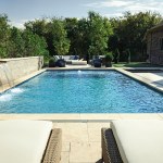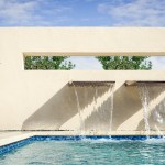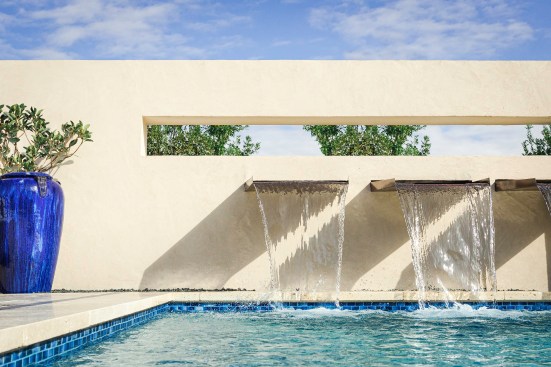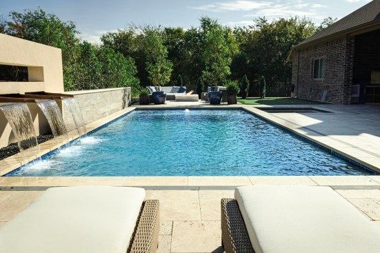The spa stayed flush with the pool. With it close to the home, Hawk didn’t want to elevate it, lest it detract from the wall and waterfeature. “I also don’t like to elevate any spa vessels when they’re that close to the house because it tends to feel a little tighter,” he adds.