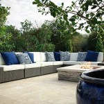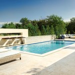 The deck and coping are made of a beige travertine. An accent strip of black volcanic basalt stone behind the coping adds contrast and provides a nice transition from the large-format coping to the more intricate Versailles patterned deck.