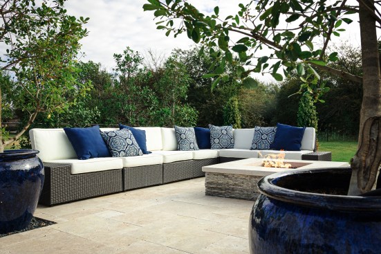 Below the waterfeature, he placed Tejas black gravel to create a sense of depth when contrasted against the light materials surrounding it.