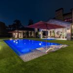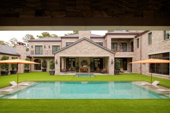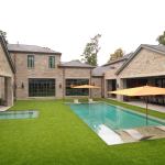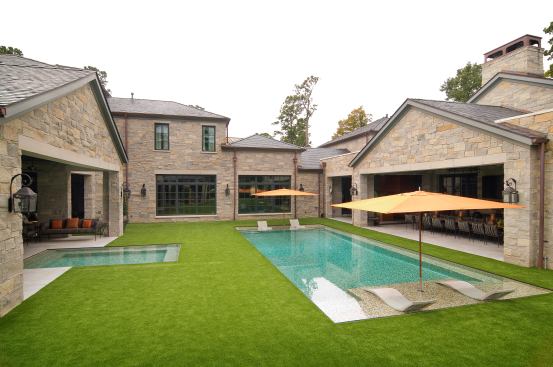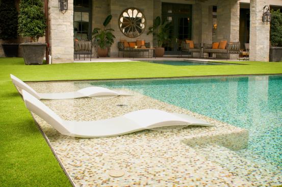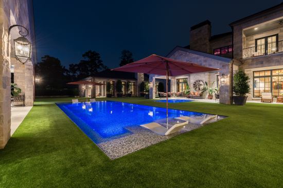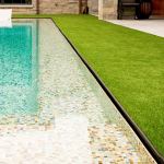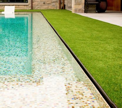 Luminescent elegance: To make the surface as sleek as possible, the homeowner chose to blanket the entire interior with a 5/8-by-5/8-inch glass tile, in a range of browns to match the natural stone on the house. This added an extra degree of difficulty to the crews as they worked to a 1/32-inch tolerance over the 206 feet of overflow edge. Iridescent tiles make up about 1/3 of the abalone-colored mixture, to add a glow to the surface. “The customer didn’t want the entire pool to be 100-percent iridescent,” Pavlesic says. “He wanted a little bit of subtlety but he wanted it to shimmer.” The pool and spa, which also features a slot-overflow design, have separate holding tanks constructed of shotcrete and buried 10 feet underground. When considering turf, the designers found three or four samples that could hold up to chemically treated water, then presented them to the homeowner, who chose based on look and feel. Just in case, all turf within 3 feet of the slot was set such that it could be easily replaced if it wears more quickly than the rest.