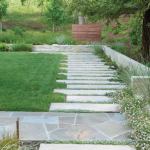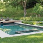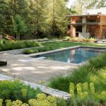 The raised planter walls on either side of the pool are covered in Old Spruce Mountain stone, a ledger also used to veneer the outdoor surface of the home’s fireplace. The pool equipment was concealed behind Ipe panels to the side of the pool.