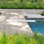 Elevated 14 inches above the pool coping, the deck is covered in Ipe wood, chosen for its durability and resistance to splintering. This deck provides the main congregation and activity area, with plenty of seating.