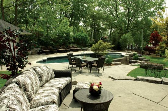 Despite a picturesque location off the shores of Lake Ontario, the sloping backyard with more than a meter’s worth of grade difference was a less-than-ideal space to build a pool. Fortunately, the homeowner’s vision of an aquascape with a vanishing-edge waterfall fit perfectly with the topography.