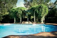 A precast fountain under an immense pergola forms a focal point. From the home’s elevated wooden deck, visitors can view the fountain and the pool.