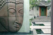 As visitors push through the front gate, they are greeted by the large, meditative face of a Buddha. Water streams gracefully down its features, while bamboo gently brushes its cheeks. The water also appears to be cleansing the Buddha’s head.