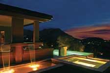 Strategic lighting makes the project appear like a natural extension of the earth. “There was a flow to it, a visual direction,” says Scott Freymuller, president of OIB Landscaping and Lighting in Scottsdale. He designed and installed the lighting scheme using low-voltage halogen lamps. “We wanted the eyes to see the house first, then be attracted to the pool area, then the mountain and then take it in all together.”