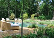 To contrast the rose and peach Tennessee stone, cream-colored furniture with stark white cushions was hand-selected by the homeowner, who is a furniture dealer. Creating a grid of sherbet-colored decking, the stone stays cool in the hot summer months. Its colors continue into the water, where it lines the pool’s stairway entry as well as the interior of the spa. The bright color is subtly contrasted by the gray interior finish. Stone tile is set into a small bench along the waterline, adding deeper shades to an otherwise sunny, gardenlike setting.