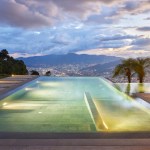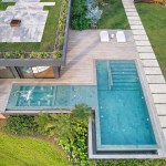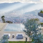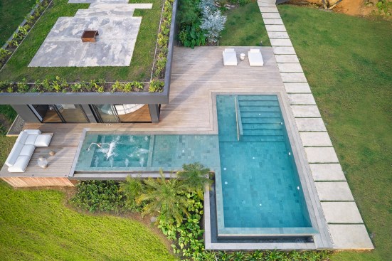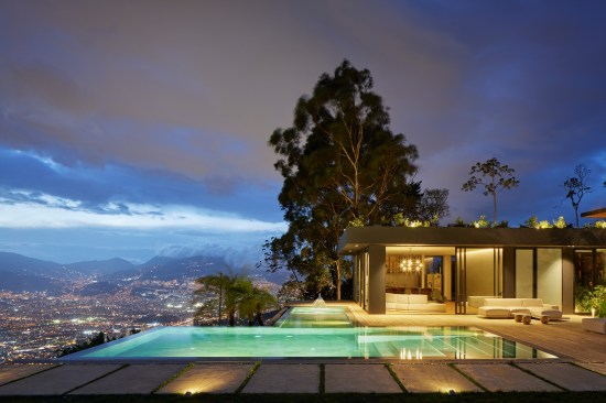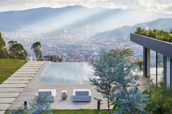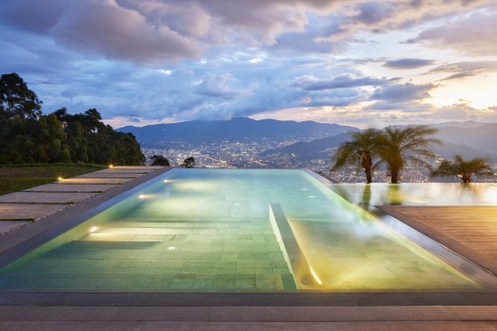 “This project celebrates harmony,” says Alejandro Soto, head of the design department with Ambiente Azul in Medellin, Antioquia Columbia. “It’s about coexisting with the elements — sun, mountains, landscape, wind and the panoramic view of the City of Eternal Spring. Placing the pool close to the house and giving it a T-Shape allows a better communion with the flat architecture of the home and the large terrace.”