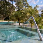 The pool needed to accommodate swimming and spa therapy, include lounging areas, integrate simultaneously with the modern, straight-edged home and surrounding nature, and provide access options that fell in line with the design.