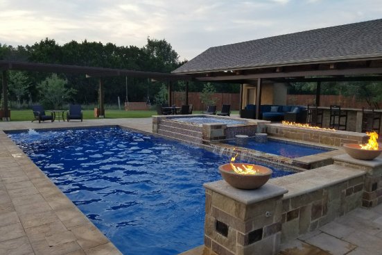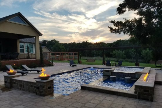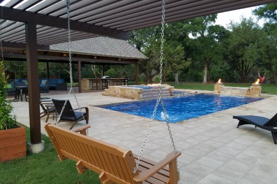 The design for this installation in Dripping Springs, Texas, started out with a Pleasure Island pool/spa combo shell from San Juan Fiberglass Pools with a custom tanning ledge. But once the excavation began, the homeowner felt that the footprint was going to be too small. So Bret Shallenberger, owner/president of Nxt Gen Fiberglass Pools & Spas in New Braunfels, Texas, headed back to the drawing board, and the pair ultimately settled on this three-piece hot tub/pool/tanning ledge set design.