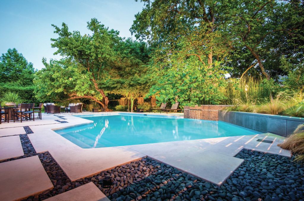 Almost from scratch: Angell kept what was best about the site — the original pool shell and some existing trees — and scrapped the rest. The main design challenge? To make the pool shape fit in a modern theme. “There was not one angle that aligned with another, and nothing was squared with the house,” Angell says. “It was just a combination of really odd angles.” He tempered that shape with the cantilevered coping, which was colored and sized to resemble large slabs of Lueders limestone. The back of the coping does not go in a straight line, but pulls in and out. The gaps between the hardscape slabs are wider than normal and inset with black Mexican pebble. “By creating that rather random rectangular shape to the backside of the coping and paralleling it with the house, it helped me deal with the pool’s very irregular shape,” the designer says. “It helped downplay that existing shape, by taking the eye away from those irregular angles and squaring it off more with the house.” The lighter color of the concrete helped create a feeling of calm and spaciousness.
