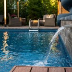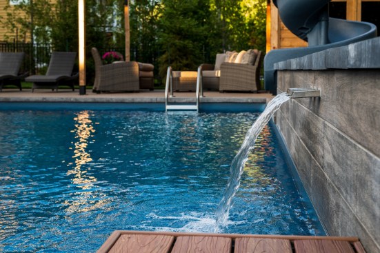 Pebble finish is used on the interior and the sun shelf. A straight-edged, gray-toned Lueders cut stone is used for the coping. The deck is finished in a porcelain tile that closely resembles travertine.