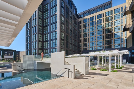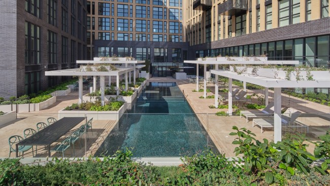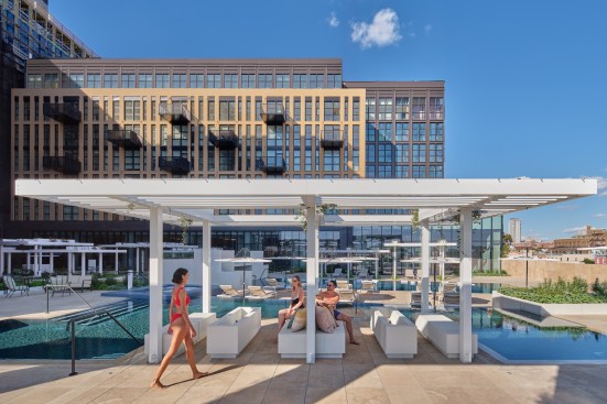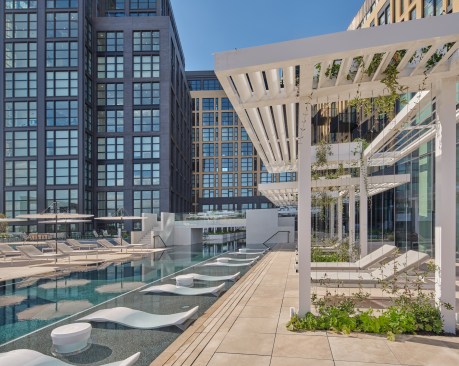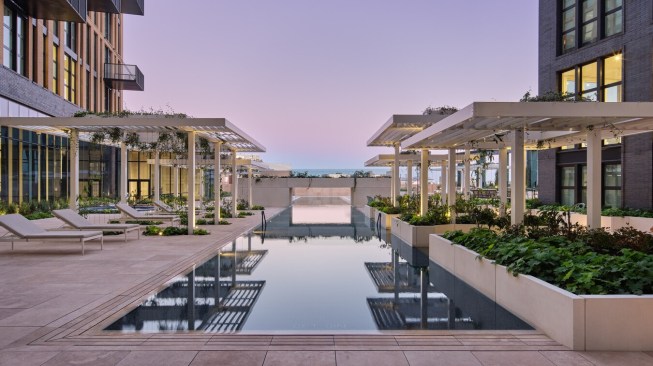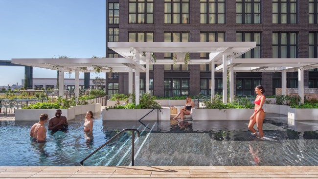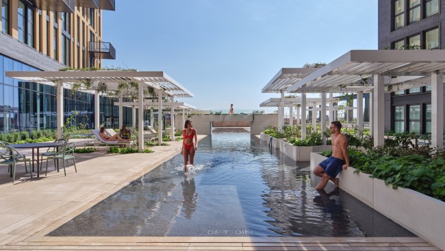 Rooftop pools always bring technical challenges, with one being how to prevent leakage that could potentially damage the building. Complicating the situation even more, the pool was built across multiple towers. “It all reads as the same building, but structurally [they’re different],” Toavs explains.